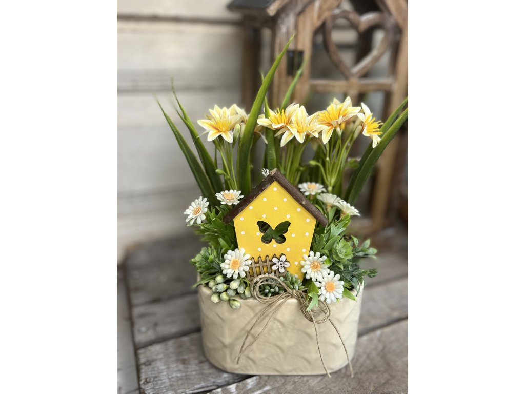Sárga ovális kaspó házikóval
